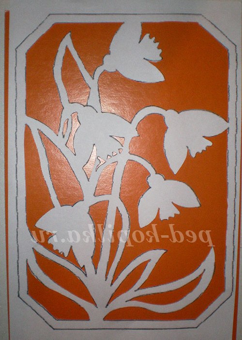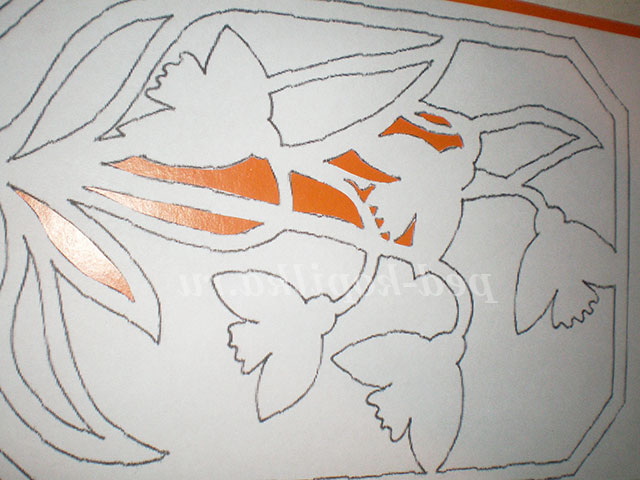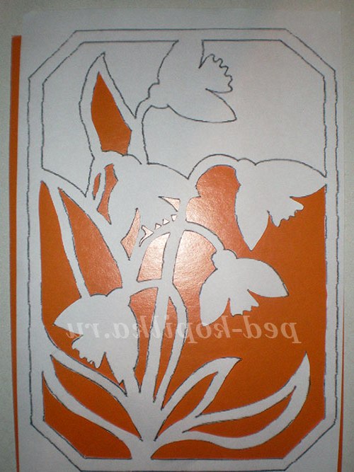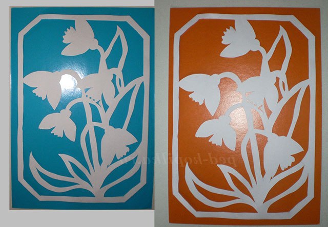 3. На кольоровий картон приклеюємо нашу витинанку (наносимо клей на ту сторону, з якої вирізали) . За основу можна вибрати будь-який колір.