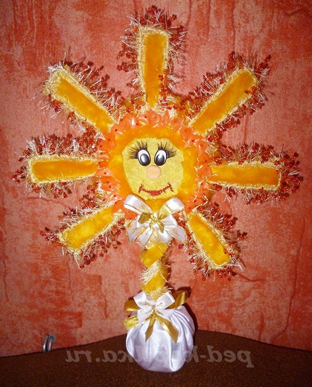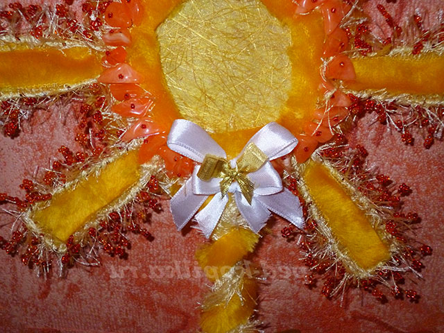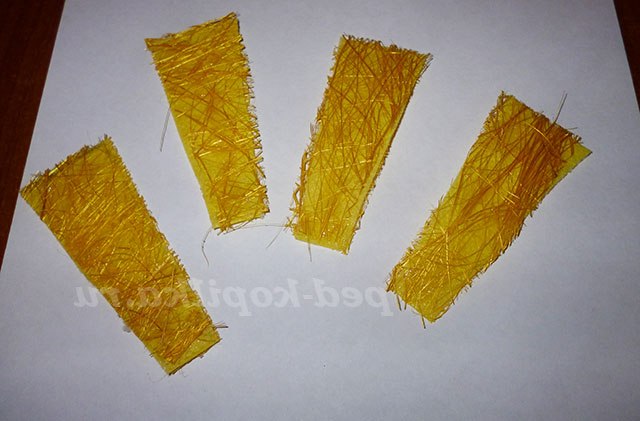 А ось тепер прийшла пора для обробки дерева. Я кожен промінчик з лицьової сторони вирізаю жовтий хутро і вклеиваю його всередину. Таким чином виходить з лицьової сторони хутро з краями сизалю, а із зворотного боку видно тільки сизаль.