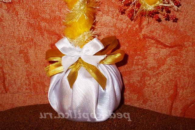 А тепер декор горщика. Тканина білого кольору (у мене креп - сатин) вирізана по колу, оброблені краї і потім це все затягнуто біля горловини. Ну, в моєму випадку вийшло трохи вище.