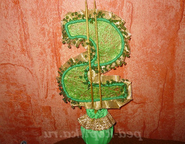 А далі вже все залежить від вашої фантазії. Я зробила стрічки в горщику і переходу на стовбур. Покрила їх лаком для малювання на нігтях золотого кольору. А також, по спіралі обкрутила хутром стовбур, щоб надати йому об'єм.