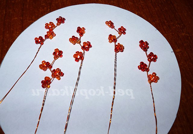 Плету такі ось гілочки з бісеру помаранчевого кольору. Техніка плетіння «назустріч». На кожній гілочці три гуртка в якому по 5 бісерін.