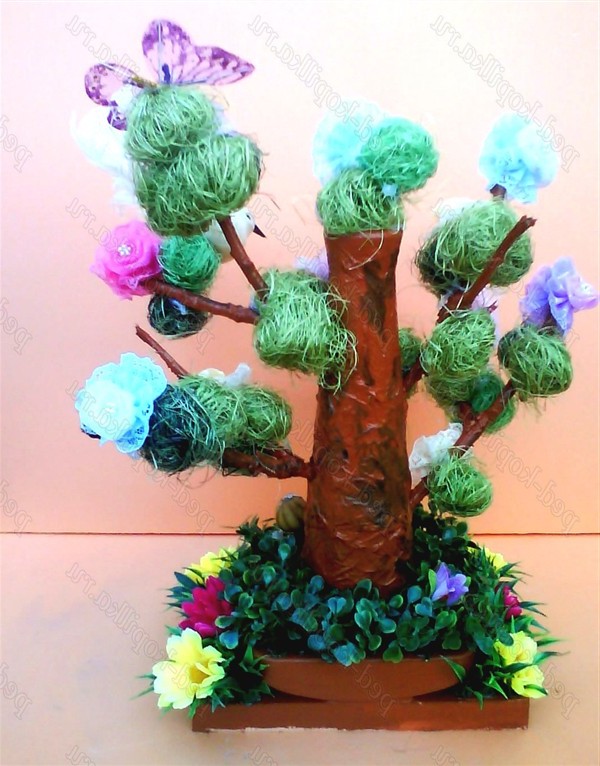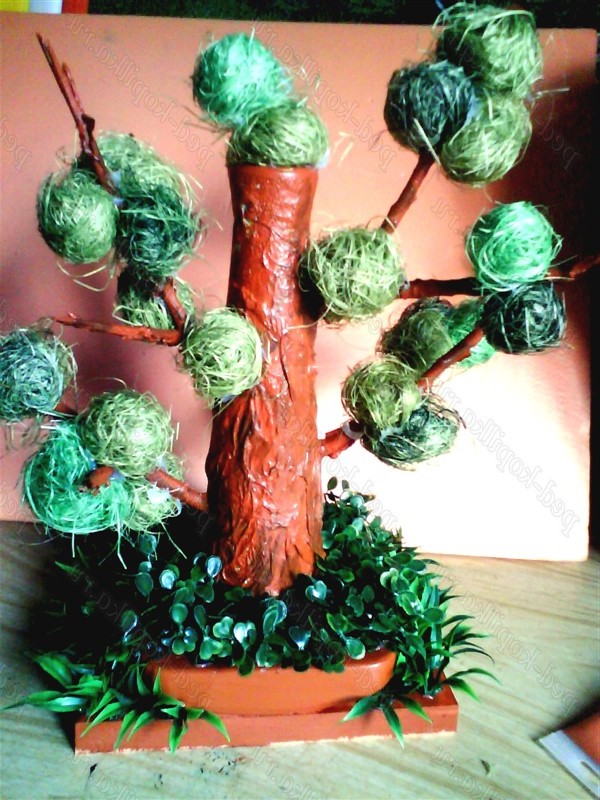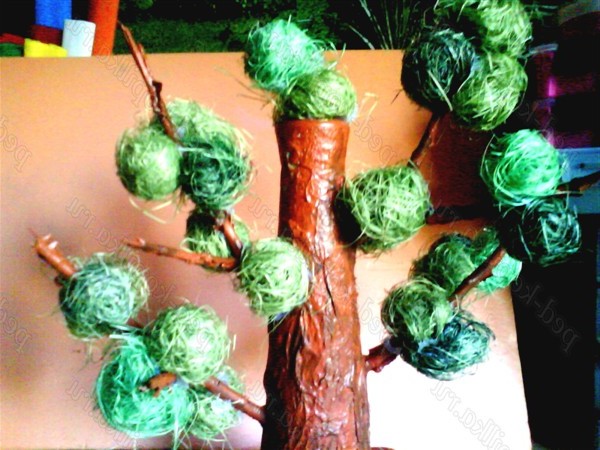 Починаємо декупаж нашого дерева, зелені грудочки за допомогою гарячого клею ми приєднуємо до гілок на дереві