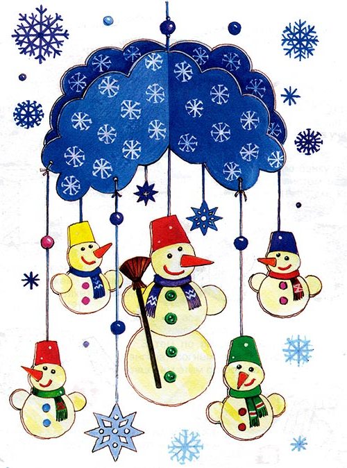 Дуже цікавим прикрасою інтер'єру можуть бути різні мобілі. Давайте зробимо мобіль з сніговиків, які закружляють у веселому танку під сніговою хмаркою.