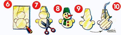 9. Склеим обидві частини сніговика, не забувши всередину вставити товсту нитку або стрічку.