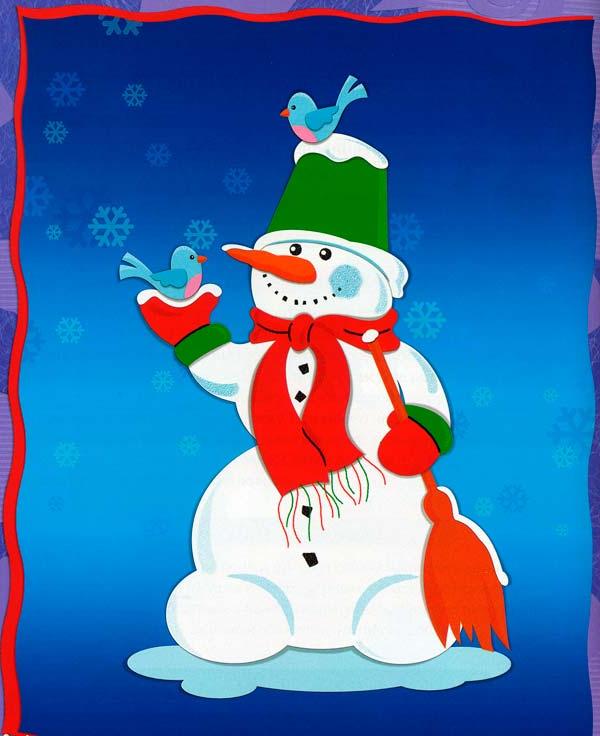 Ця саморобка аплікація Сніговик, виконана у великому розмірі, прикрасить кімнату, вікно, двері, а в маленькому варіанті - може стати вітальною листівкою або прикрасою на подарункову сумочку, коробку.