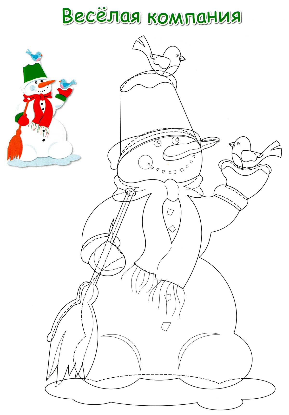 Фігурки птахів зробіть окремо і тільки потім наклейте на відро і руку сніговика. На тулуб птаха приклейте крило і грудку. Чорним фломастером намалюйте очі, нижню частину дзьоба заштрихуйте помаранчевим фломастером. Снігову галявину підклейте знизу, під фігуру сніговика.