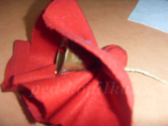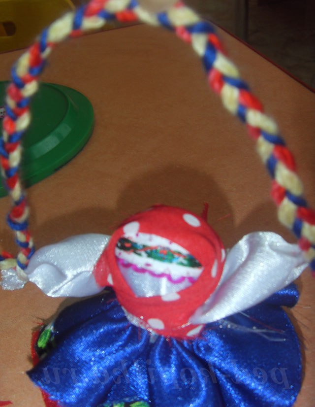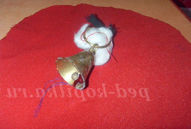 Шматочок вати акуратно складаємо в форму кулі-це голова і прикріплюємо до низу дзвіночок, накриваємо «голову» кругом з тканини і фіксуємо, потім другим колом-фіксуємо нитками, третім-фіксуємо.
