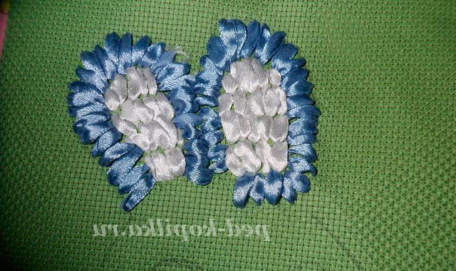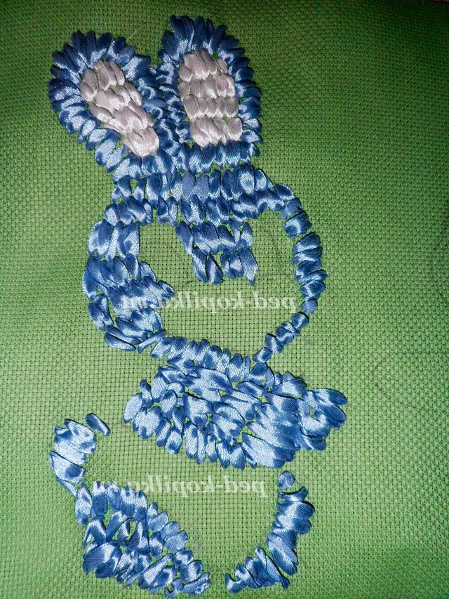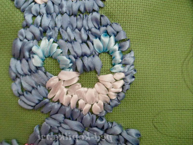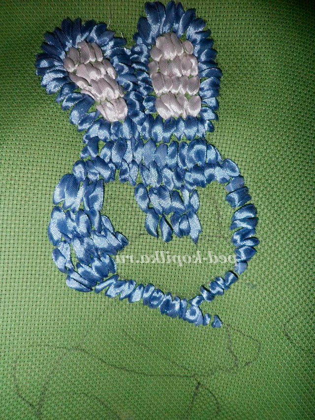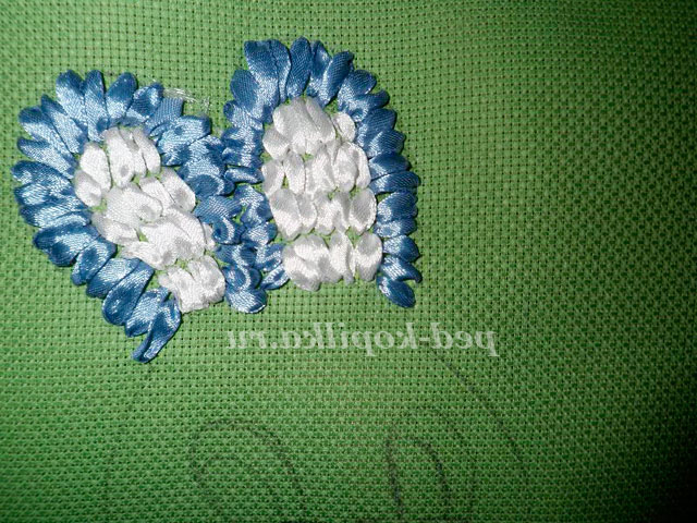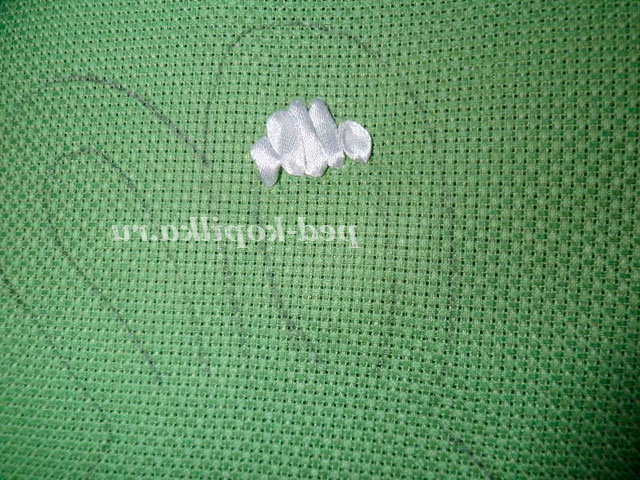 Вишиваємо швом «прямий стібок». Протягуємо голку зі стрічкою на лицьову сторону канви в точці А. Розправивши стрічку, вколюємо голку в точці В і протягуємо стрічку на виворітну сторону.