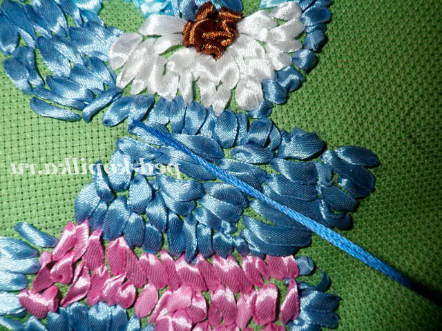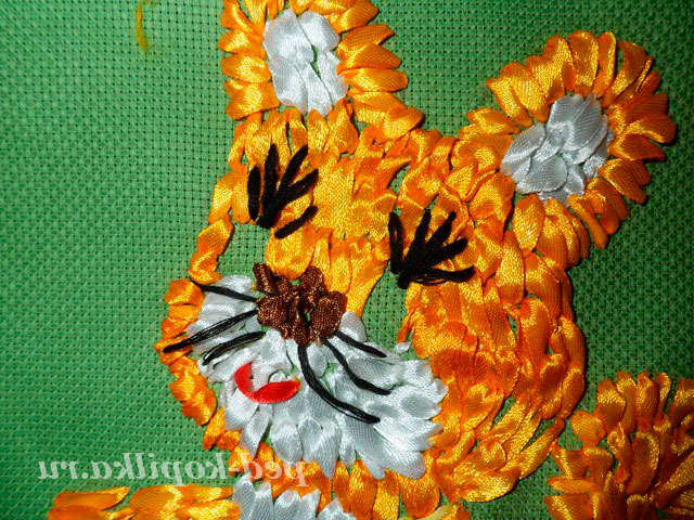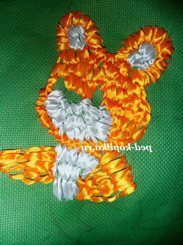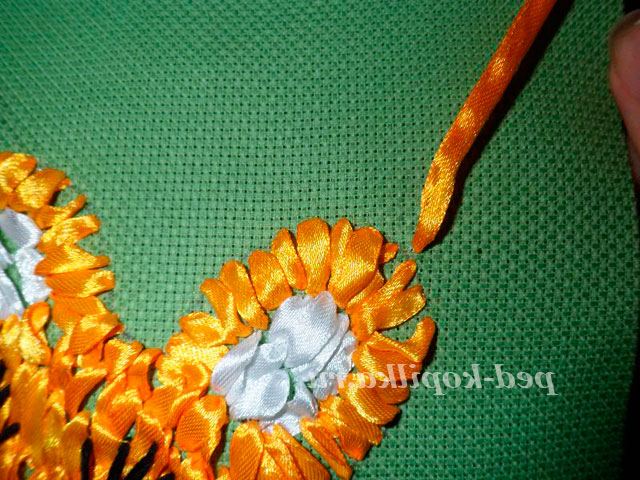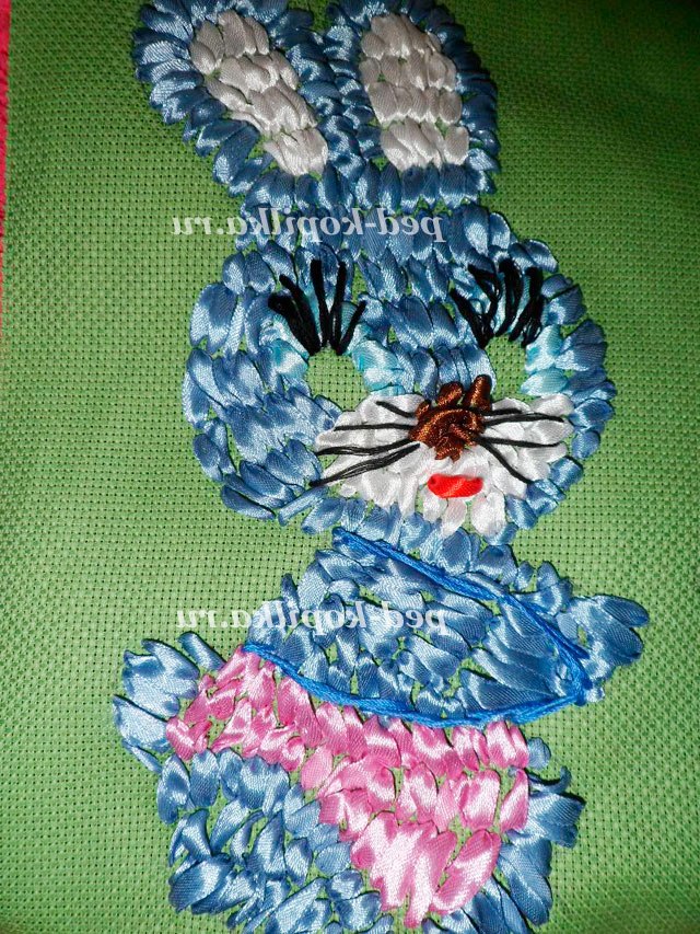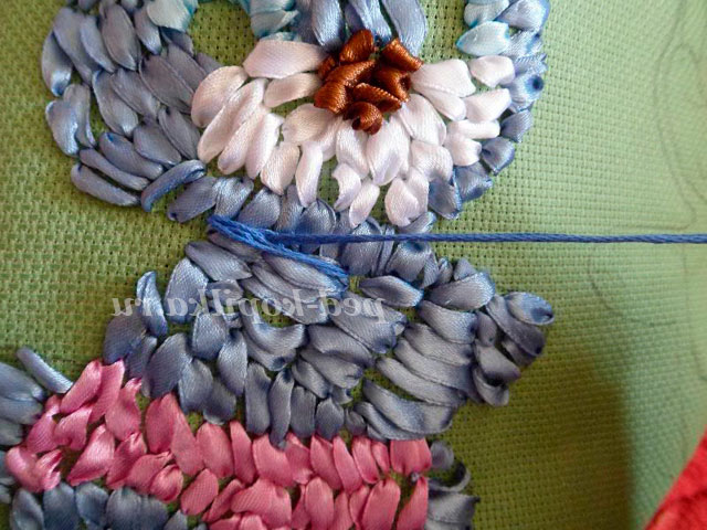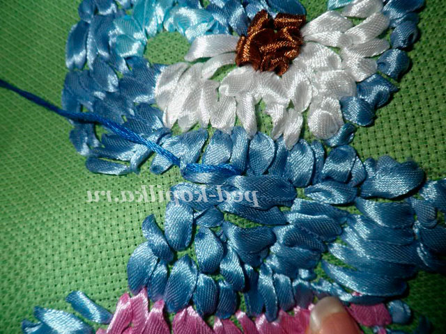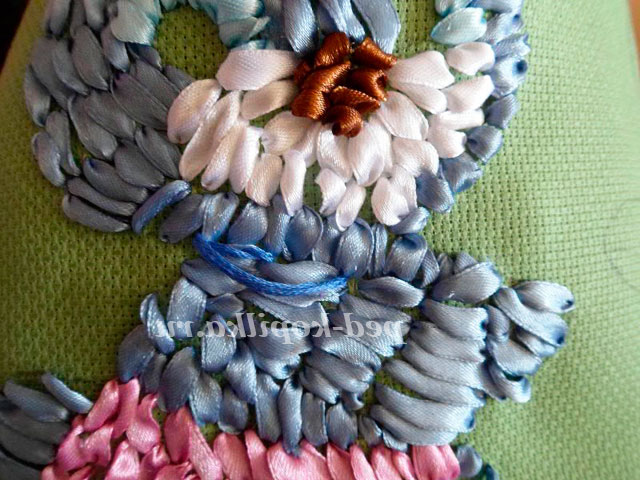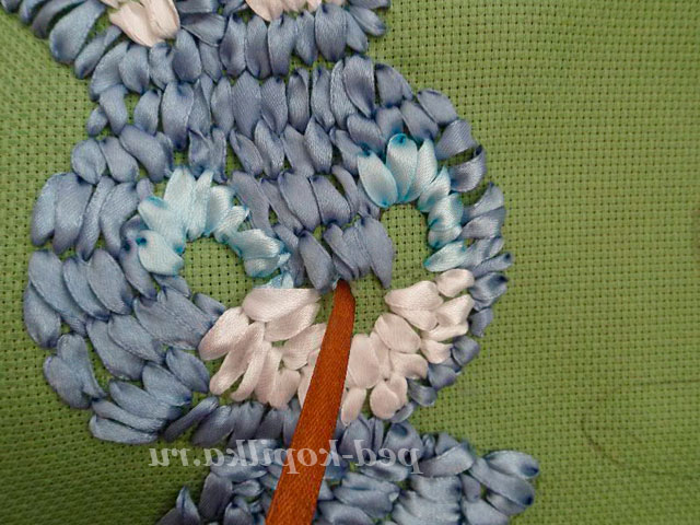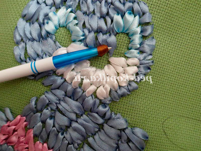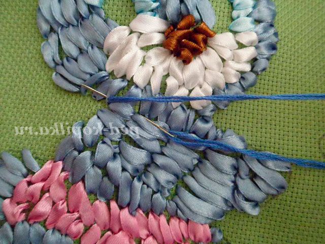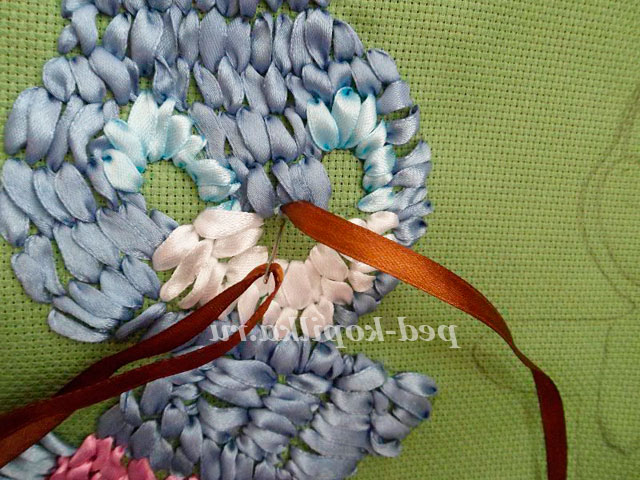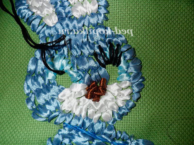 Робимо завитки на вушках. Протягуємо голку зі стрічкою на лицьову сторону канви в точці А.