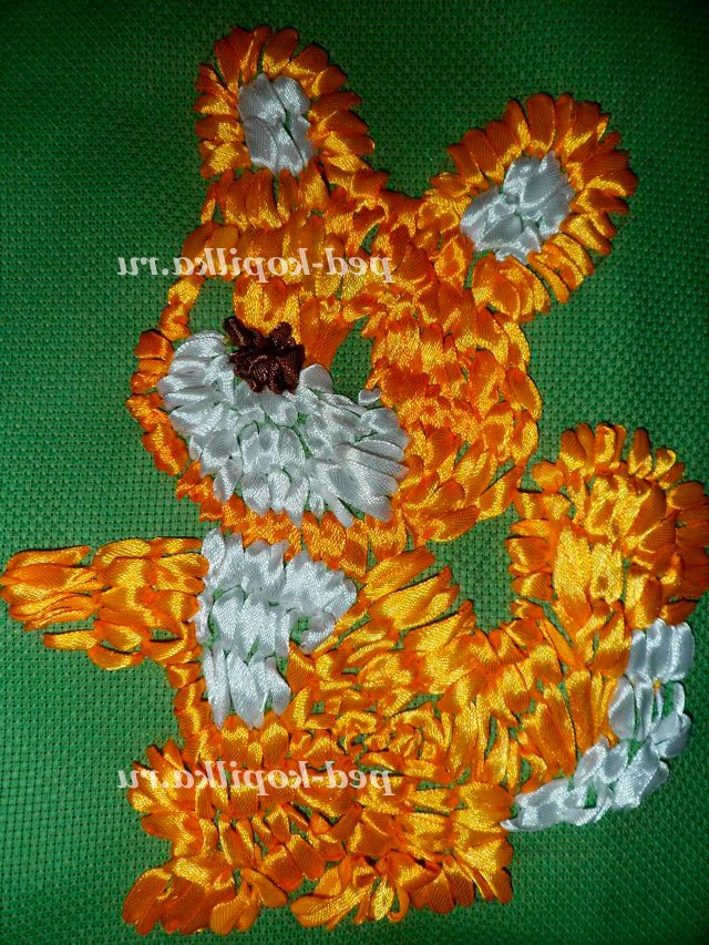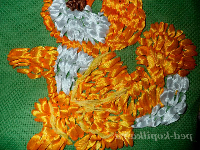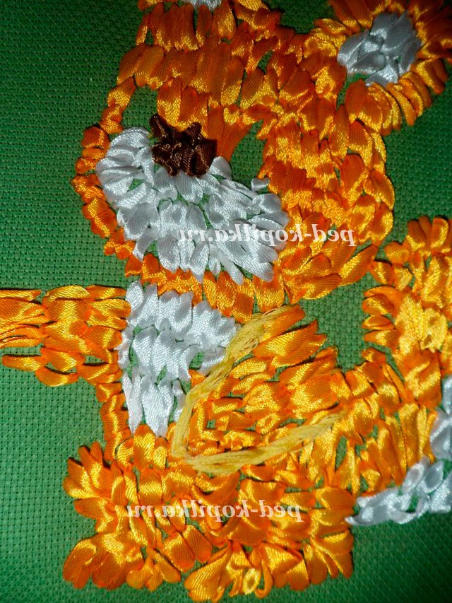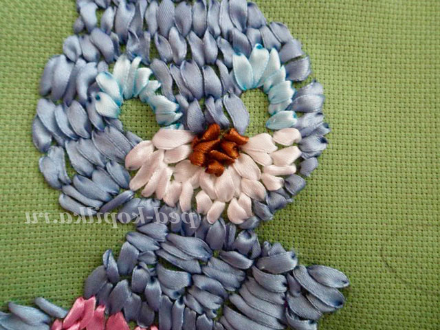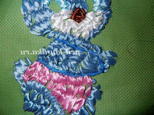 Носик вишиваємо швом «повітряна петля». Виводимо голку зі стрічкою на лицьову сторону канви в точці А. Вколюємо голку в точці Ст. Трохи витягуємо петлю ручкою.