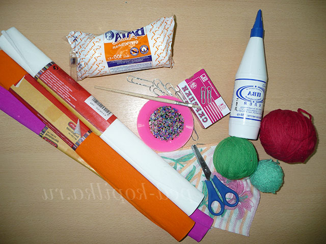 - 2 намистинки, картон, кольоровий і креповая папір для прикраси;