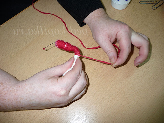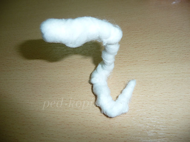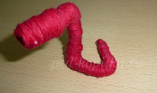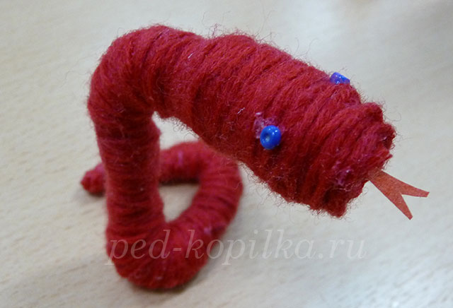 3. Отриману заготівлю обмотуємо кольоровими нитками, починаючи з голови змії. Не забуваємо промащувати вату і нитки клеєм ПВА і щільно притискати витки ниток між собою.