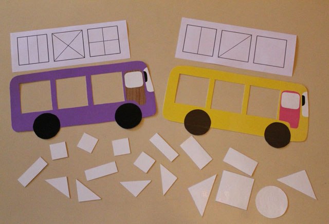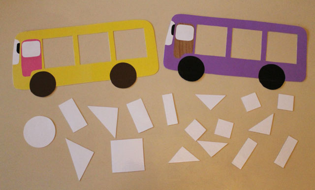 1. Автобуси (площинні) без вікон, набір геометричних фігур.