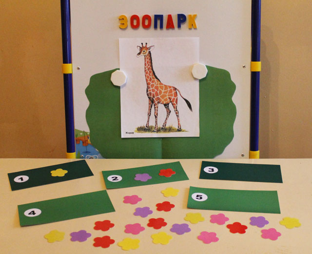 - Хлопці, давайте допоможемо жирафу зібрати квіточки. Потрібно зібрати стільки квітів, скільки показано на картці. Збирати квіти можна різного кольору.