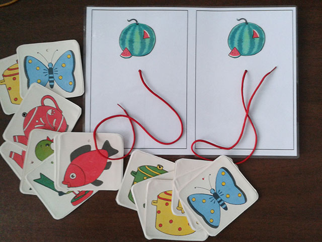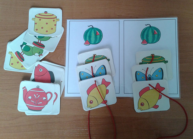 Обладнання: альбомний аркуш з двома однаковими картинками (для міцності-заламінувати), два шнурка, парні картинки.