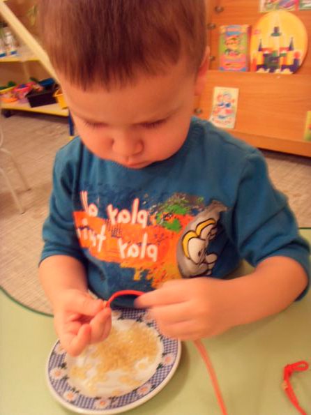 Крім того, макарони-трубочки можна нанизувати на шнурок, вийдуть намисто. Одночасно тренується дрібна моторика.