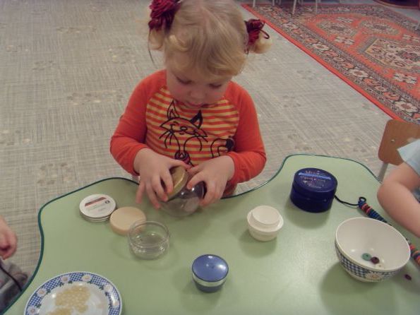 Поставте перед дитиною кілька баночок, ємностей (вони повинні відрізнятися розміром і формою) з закритими кришками. Запропонуйте відкрити всі баночки, а потім знову закрити, правильно підібравши кришки. Можна дати їх відразу відкритими - це вже варіант складніше.