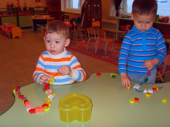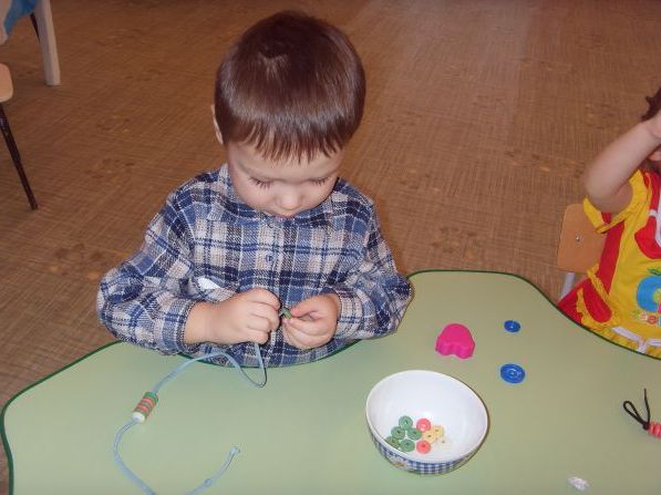Дітям 3-4 років можна дати дуже цікаве заняття: нанизування намистинок, гудзиків тощо Малюки люблять зробити гарне намисто для мами, браслет для бабусі. Такі заняття допоможуть розвинути окомір і посидючість, а також дрібну моторику.