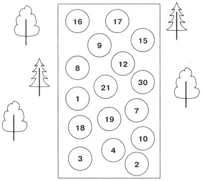7. Алфавіт. Перед командою намальовані крейдою 15 гуртків з цифрами. Суддя пропонує перевести слово «Браун» з алфавіту в цифри (А - 1, Б - 2...). Завдання команди пройти цю пастку, наступаючи тільки на ті гуртки, де є цифри з імені Браун(2, 18, 1, 21, 15). Штрафний бал отримує учасник, який зробить помилку і не встане на той коло.