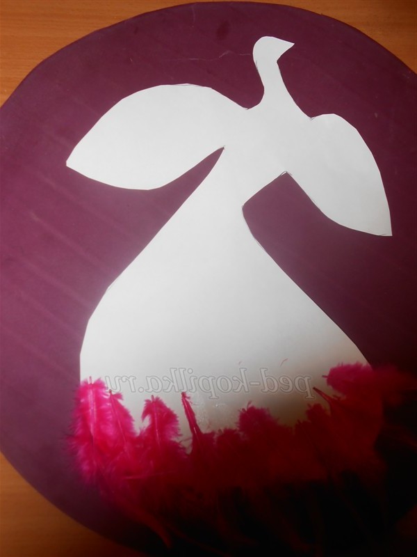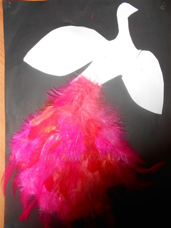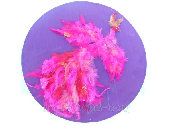 7. Наклеїти пір'я у напрямку знизу вгору на тулуб і голову. Прикрасити голову птиці чубчиком.