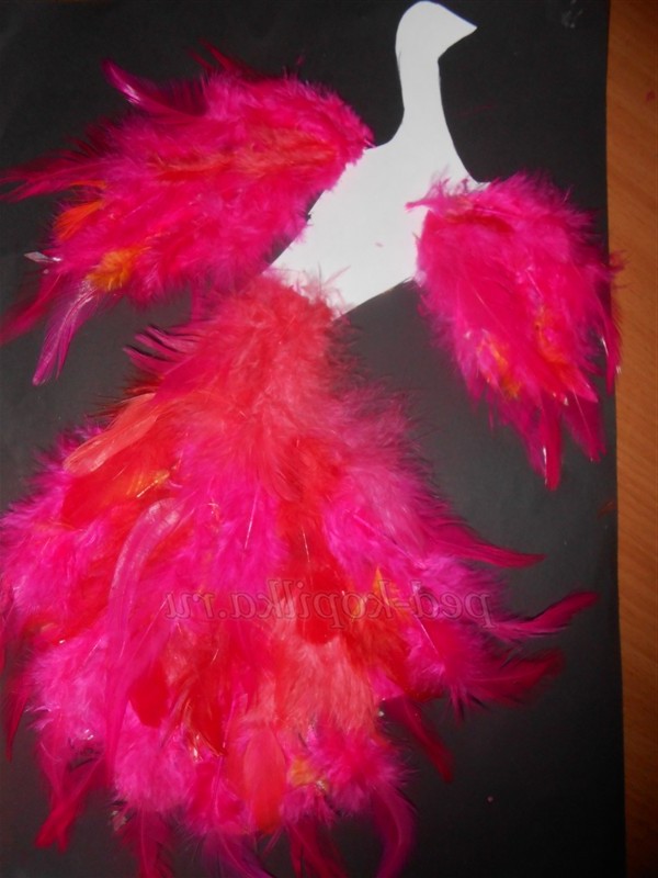 2. Починаючи з хвоста, наклеїти ряд пір'я потрібного кольору.
