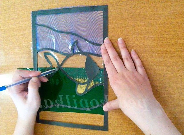 З фіолетовою вітражного папери вирізається прямокутник розміром 11 на 18 див. Готова смужка прикладається і намічається ручкою по формі хвилі. Після цього закріплюється клеючим олівцем на звороті вітража.