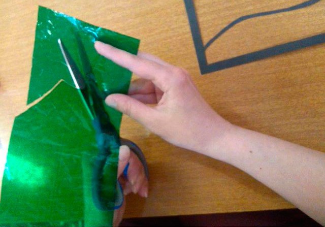 Із зеленої вітражного папери вирізається прямокутник розміром 10 на 18 див. Готова смужка прикладається і намічається ручкою за формою дна з водоростями. Після цього закріплюється клеючим олівцем на звороті вітража.
