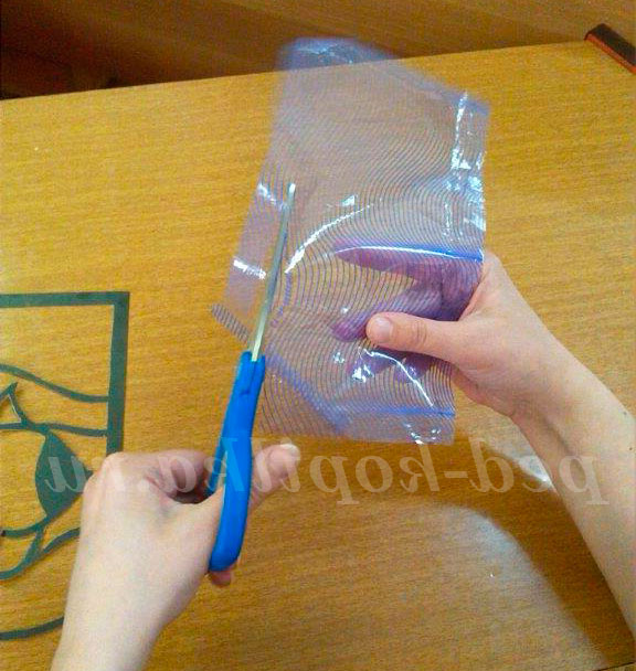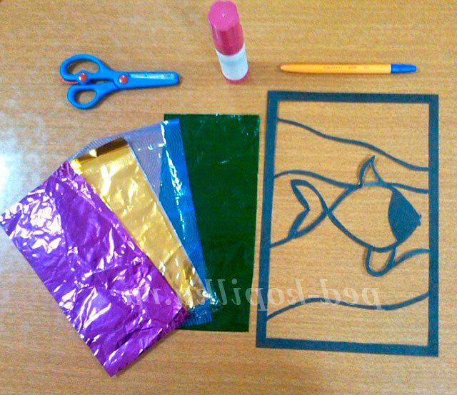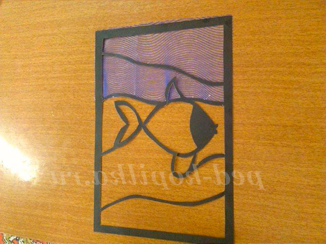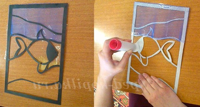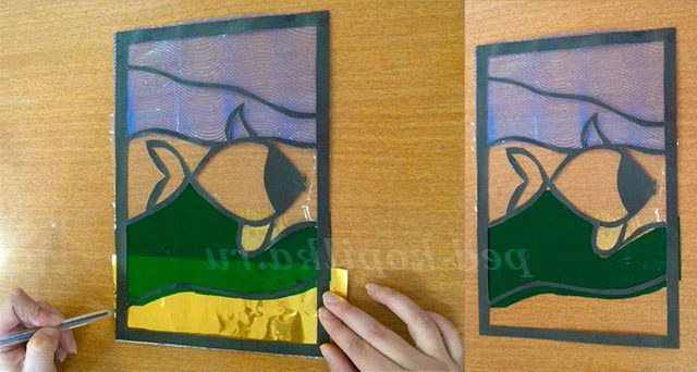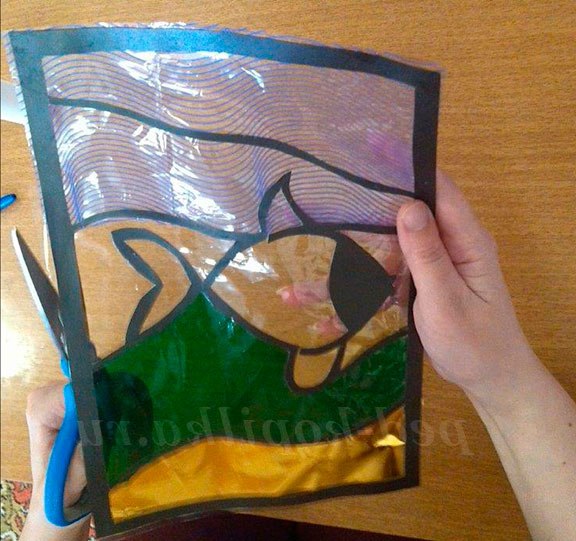 З прозорою вітражного папери вирізається смужка розміром 9 на 18 див. Готова смужка прикладається до рибці, намічається ручкою і вирізається. Після чого закріплюється клеєм олівець по формі рибки (із зворотного боку вітража). Контур рибки повинен залишитися прозорим для подальшого її прикраси.