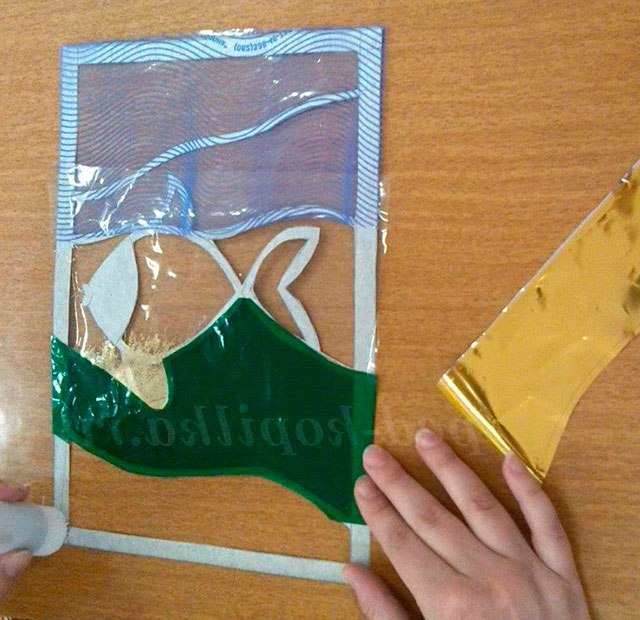 Із золотої вітражного папери, так само вирізається смужка розміром 10 на 18 див. Готова смужка прикладається і намічається ручкою за формою дна з піском. Після чого закріплюється клеєм олівець по формі морського дна (із зворотного боку вітража).
