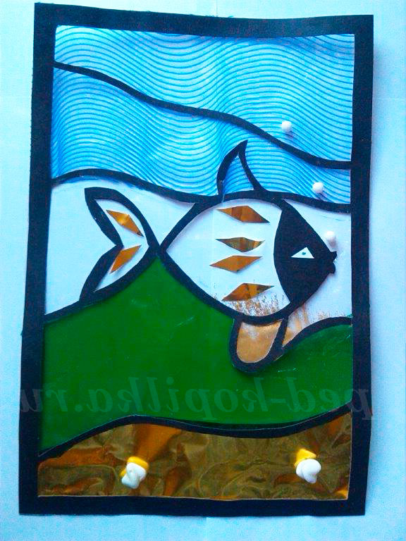 Із золотої вітражного паперу вирізають ромбики для прикраси рибки. З лицьового боку вітража, вирізані деталі прикріплюються клеєм олівець до тіла рибки.