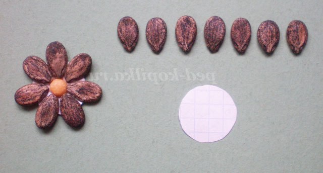 8. Приклеїти до основи гілочки з дроту і листочки з динних насіння.
