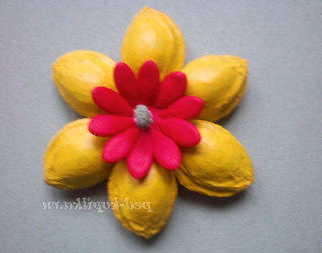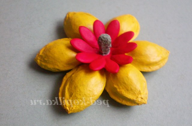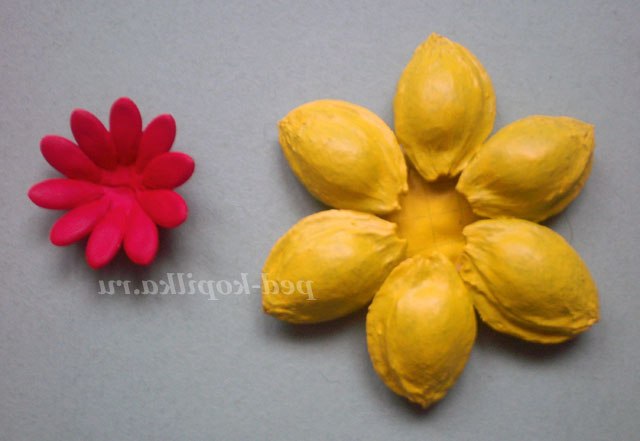3) З'єднати дві частини так, щоб пелюстки верхнього кола були між пелюстками нижнього і в середину приклеїти горошину.