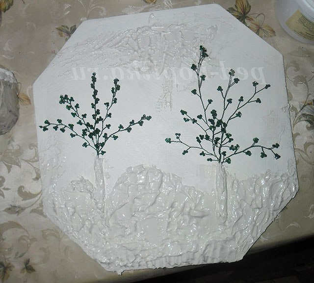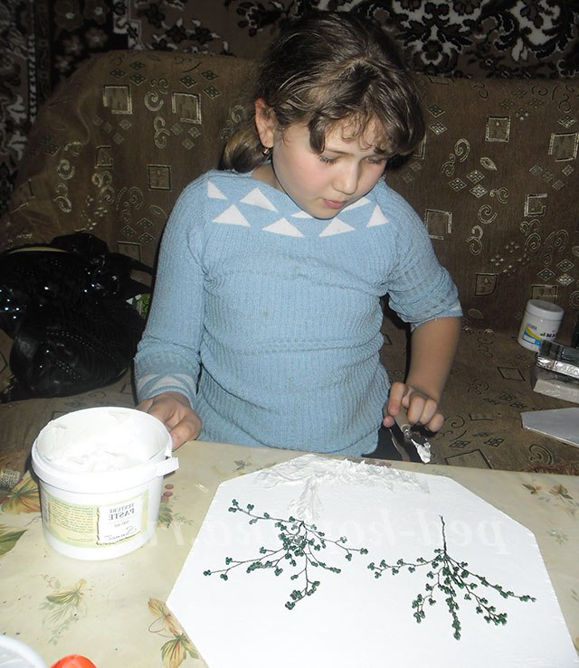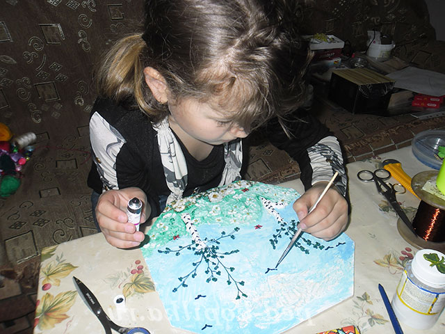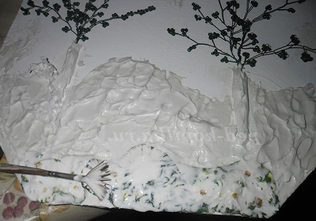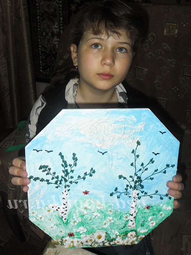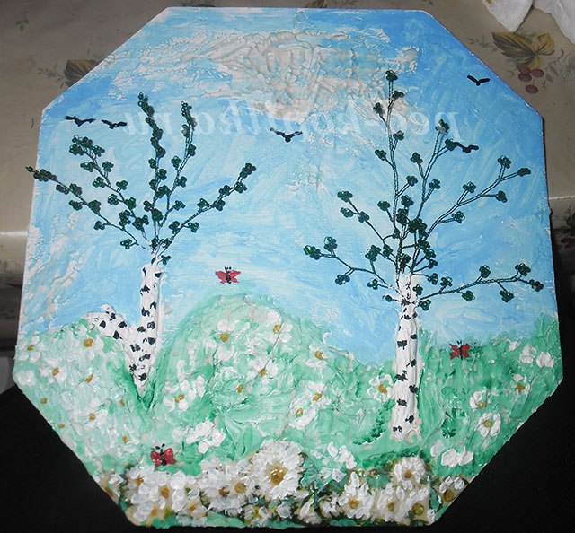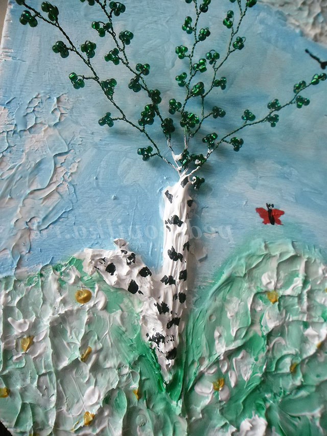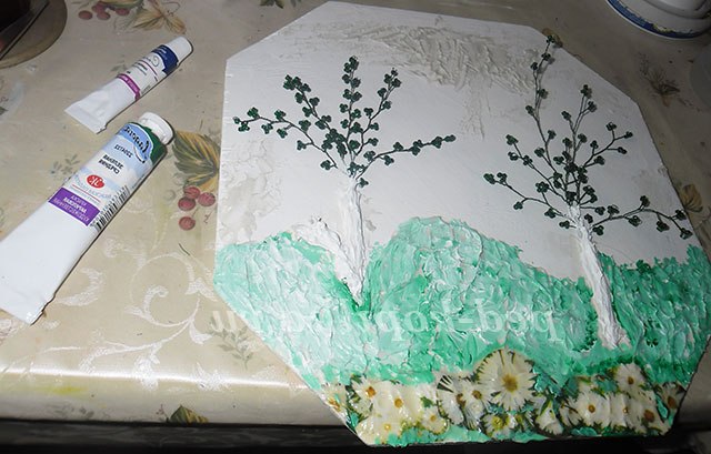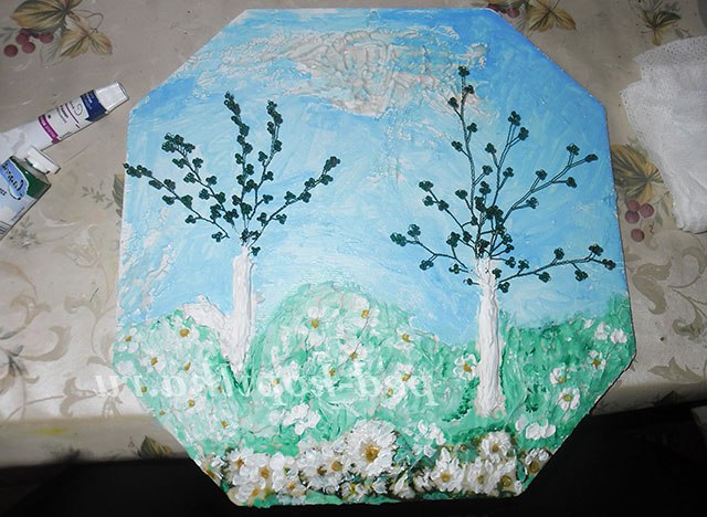 З допомогою текстурної пасти були сформованы деревця берізок, подобу галявини і хмара.