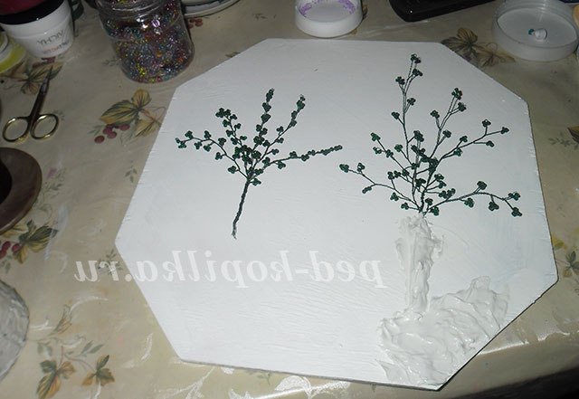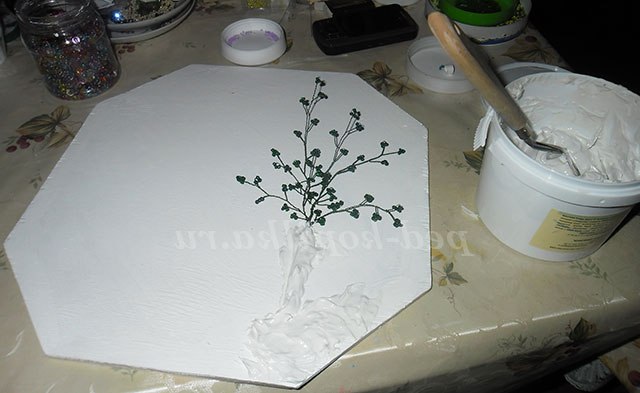 Коли все висохло - робота була продовжена. З серветки вирізані ромашки і в техніці «Декупаж» перенесені на роботу. Знову все повинно було підсохнути.
