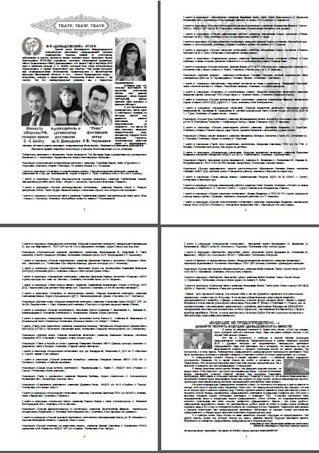 В цілому вийшов гідний огляд підсумків фестивалю, який цікаво читати не тільки безпосередньому учаснику дійства, але і мені, простому оглядачу-обивателю. У цій же рубриці розміщені нотатки про колективи з Ульяновська і Мончегорска - лауреатів ТФД. Фотографії здорово оживляють матеріал і дають гарний наочне уявлення про високому рівні костюмів акторів та оформлення сцени.