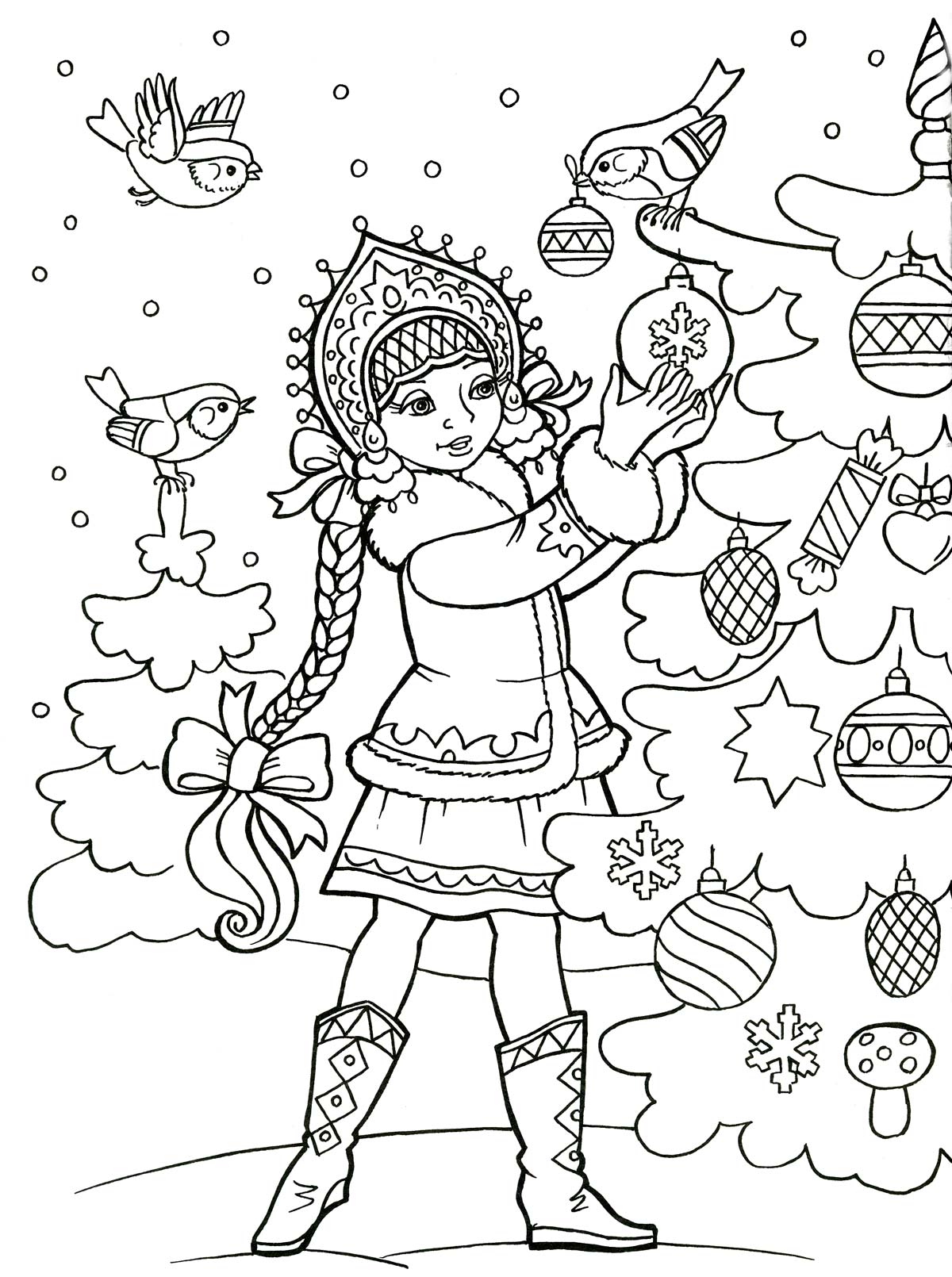 На цих розмальовках Снігуронька грає з дітьми, дарує дітям новорічні подарунки, подорожує з Дідом Морозом і веселитися на Новорічному святі.