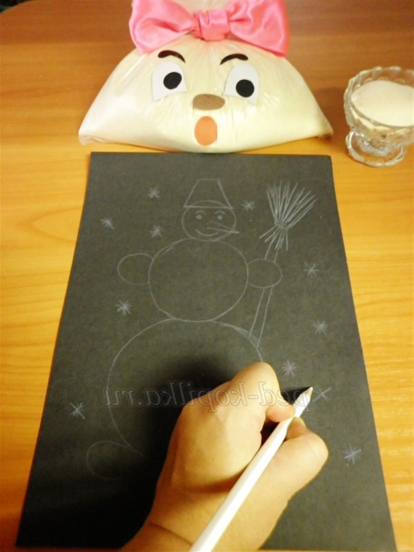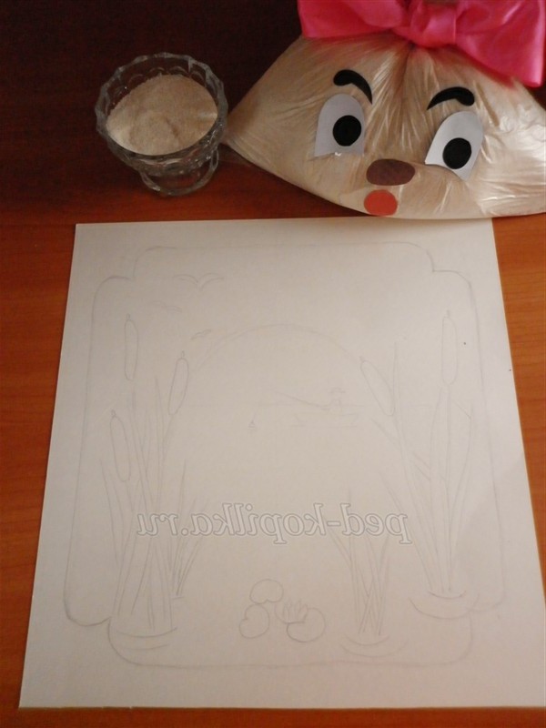 2 спосіб. Наступний спосіб малювання манною крупою припускає використання клею ПВА. Для початку потрібно з допомогою білого олівця намалювати малюнок