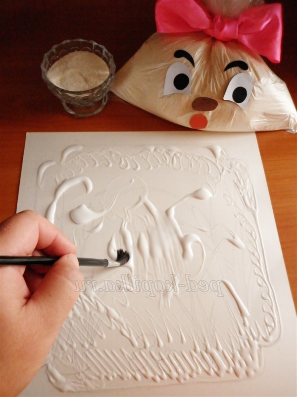 З допомогою клею ПВА промальовувати контури малюнка.