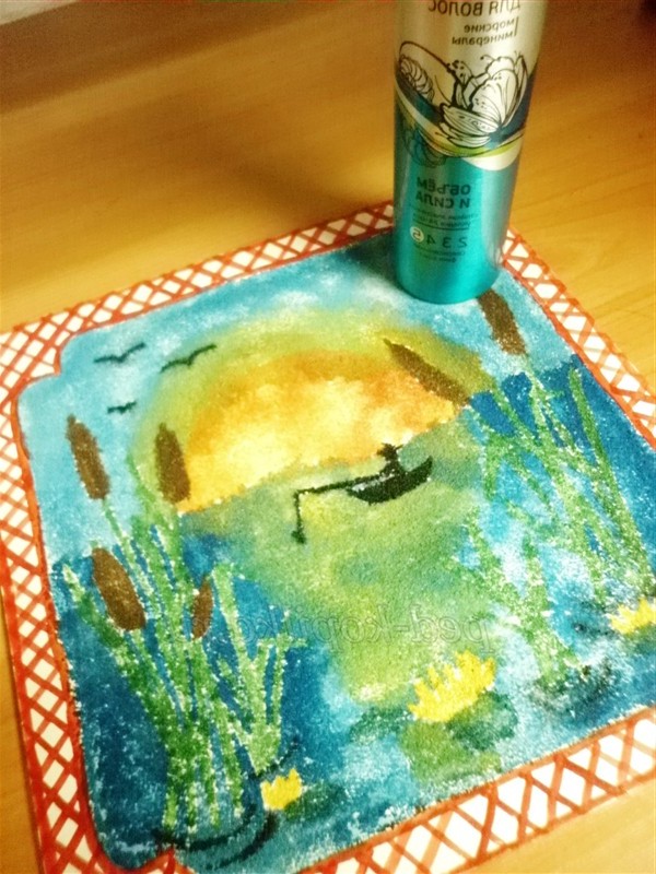 Після виконання роботи, коли вона зовсім висохне, картину потрібно покрити лаком, щоб крупа трималася.
