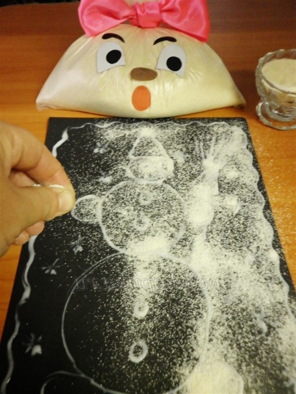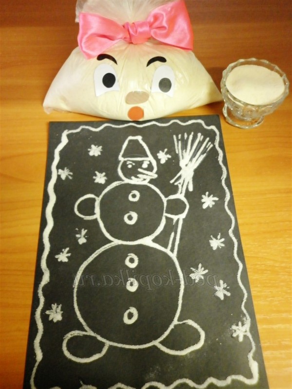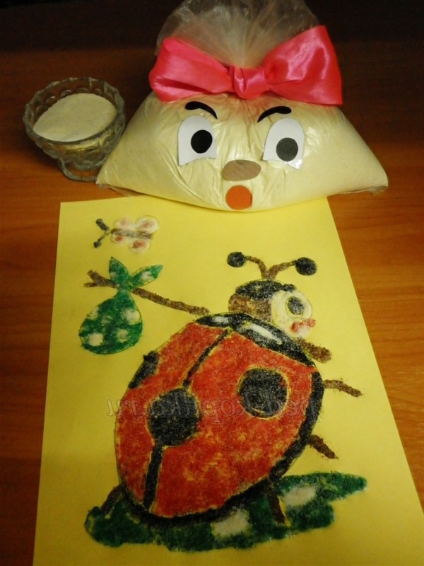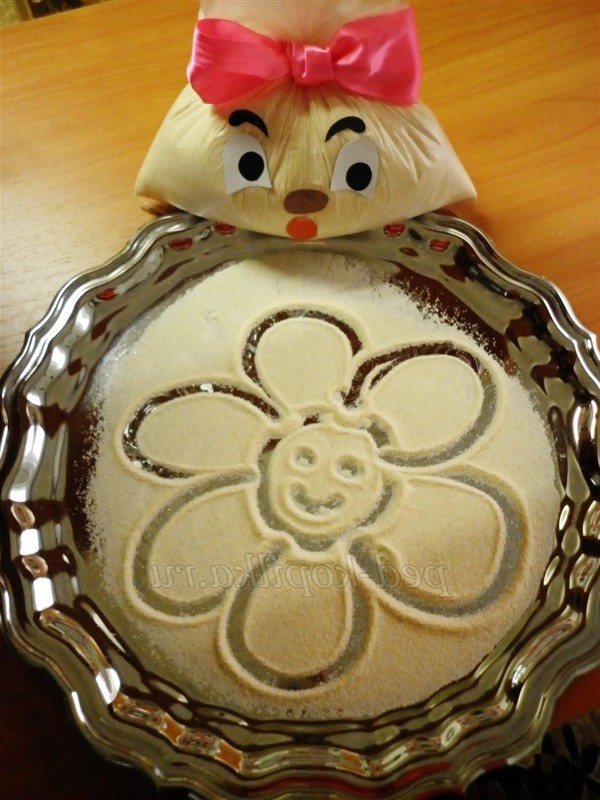 3 спосіб. Малювання підфарбованою манною крупою. Пофарбувати манну крупу можна зеленкою, йодом, але, не додаючи багато води, щоб не вийшла каша. Також можна розкришити грифель простого або кольорових олівців на аркуші паперу і розтерти в ньому крупу до тих пір, поки вона не забарвиться. Ніжні відтінки виходять при змішуванні крупи з подрібненими різнокольоровими крейдами. Ще можна злегка обсмажити на сковороді манку.