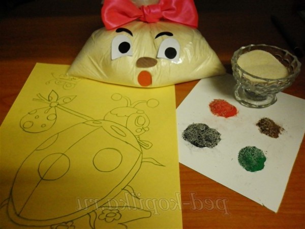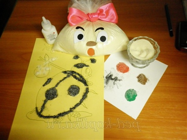 На окремі частини малюнка наносимо клей і посипаємо його заздалегідь підфарбованою крупою. Роботу краще починати з більш дрібних деталей!