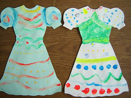 Також на заняттях з малювання застосовую ігрові прийоми з рольовим поведінкою дітей. Діти можуть бути художниками, фотографами, гончарами, будівельниками. Пропоную за допомогою фарб прикрасити візерунком силуети суконь, сарафанів, а потім організувати їх «продаж» в магазині «Одяг».