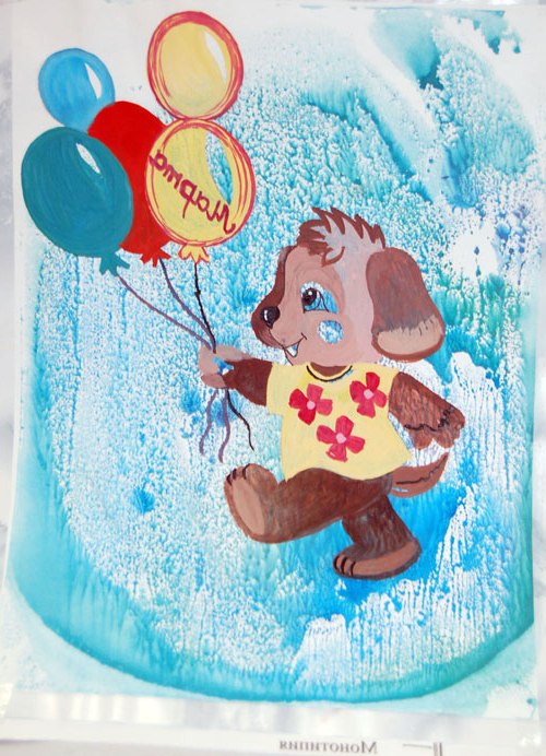 Цікавий прийом кляксографии (видування малюнків). На очах дітей капали на аркуші паперу плями тушшю або гуашшю, пропонували їм подути в трубочку для коктейлю, « поганяти» крапельку по листочку, повертаючи його. Діти спостерігали, як зливаються кольору. Повертаючи і розглядаючи те, що вийшло, діти проявляли свою фантазію, домальовували тільки дрібні деталі.