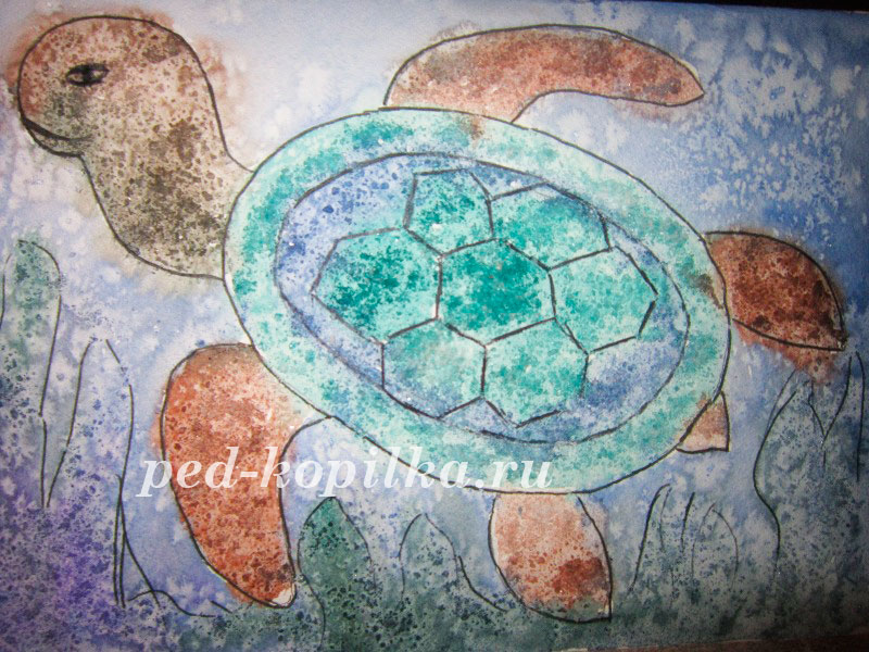 Нетрадиційна техніка малювання морської черепахи (акварель + сіль)