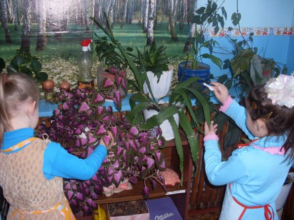 Діти протирають листочки, поливають квіти під наглядом вихователів