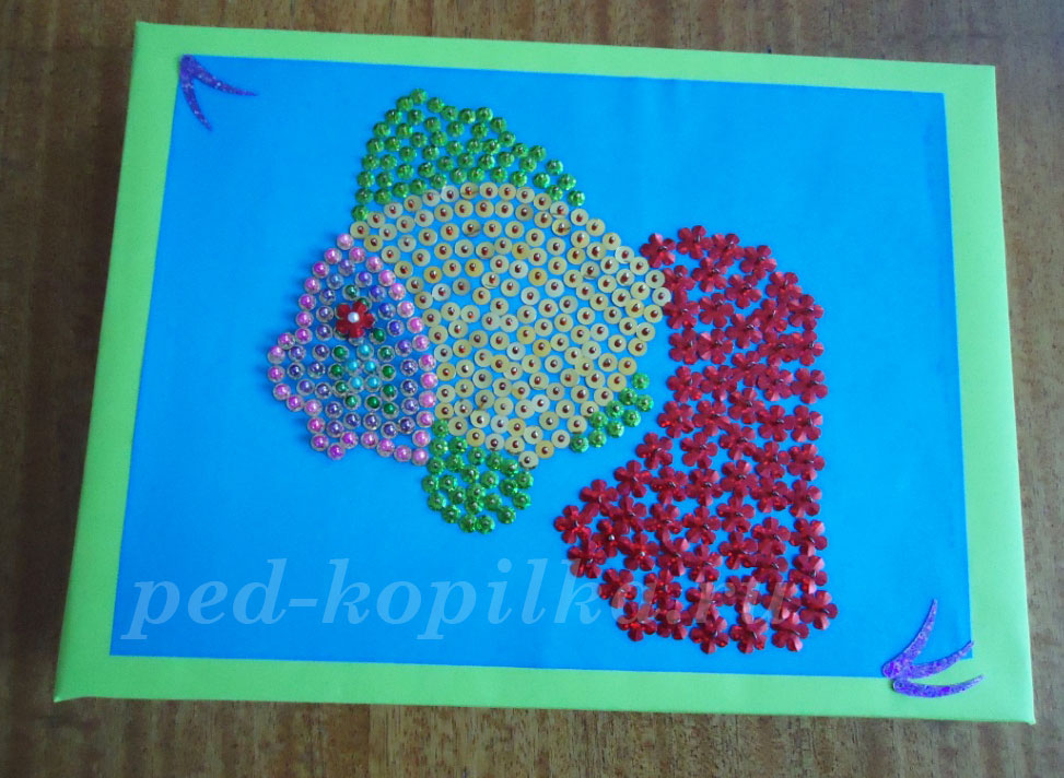 Таку картину Ви зможете зробити з пайеток і бісеру разом зі своїми вихованцями і вона буде прикрашати інтер'єр Вашого дитячого садка