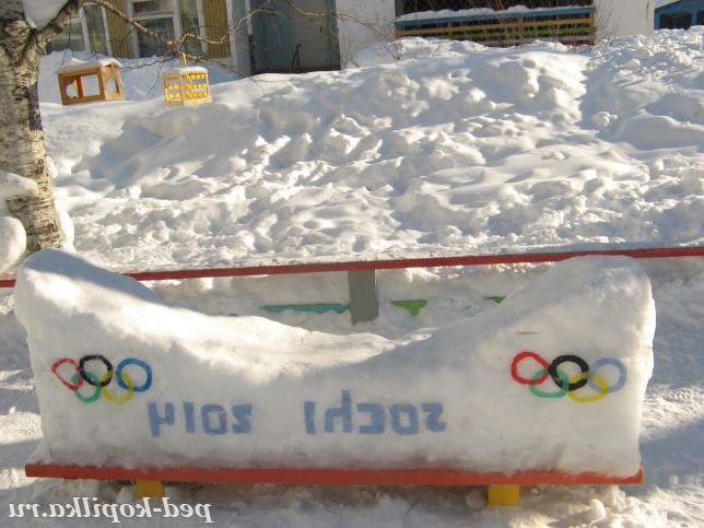 Зроблена з снігу, оформлена вирізаною символікою Олімпіади (з шматочків серветки).