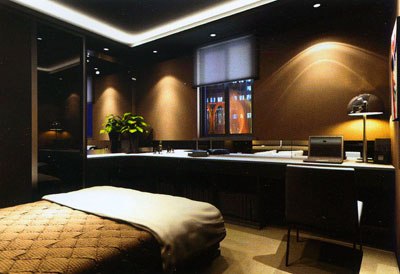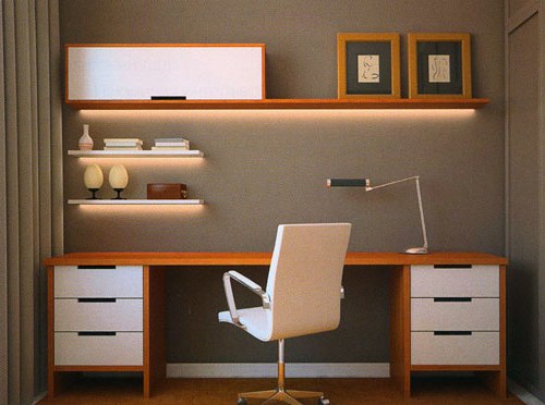 Розташувавши тут стіл і полиці, ви максимально вигідно використовуєте весь простір кімнати. Щоб позначити робочу зону, її найкраще виділити якимось контрастним по відношенню до загального кольором кімнати тоном. Якщо приміщення пофарбовано в шоколадний колір, то стільницю зробіть білою або кремовою, і навпаки, якщо стіни світлі - меблі зробіть темною. Розташування столу підкреслює і світлодіодне підсвічування стелі.