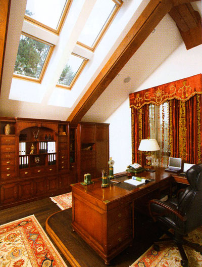 Ще один варіант кабінету на мансарді. Далеко від суєти і шуму можна спокійно попрацювати, насолоджуючись прекрасним видом з вікон. Шикарні штори, меблі з благородного натурального дерева підкреслюють статус господаря помешкання.