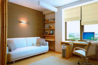 Кабінет і спальню можна об'єднати в одній кімнаті. При цьому розташуйте робочу зону так, щоб вона не з'їдала простір, а, навпаки, вигідно його обігравала. Наприклад, таким варіантом може стати робоча зона вздовж однієї з стін біля вікна. В обстановці типових приміщень біля оглядового отвору утворюється так звана мертва зона, в якій толком нічого не поставити, сюди поміщаються лише фіранки і батареї.